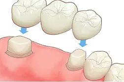ブリッジは、隣接する歯を1、2本失ってしまた場合にさらに両隣の残っている健全な歯を少し削って土台とし、そこに橋を渡すように連なった人工歯冠を被せて欠損部を補うという治療法です。