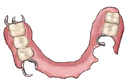 レジン製の「床(しょう)」と呼ばれる覆いが入れ歯土台についていて、部分入れ歯を入れる箇所に隣接した健全な歯(拘歯といいます)に、入れ歯から出ているクラスプと呼ばれる金属のバネを引っ掛けて固定するという仕組みです。