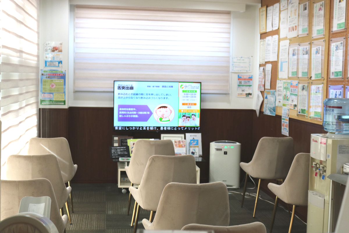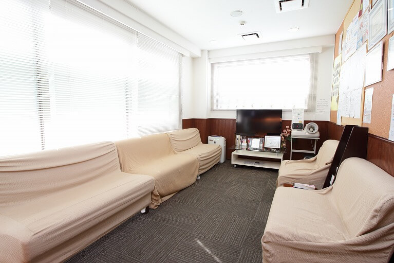 待合室です。 広々としておりテレビや雑誌もございます。 また、当院からのお知らせなども掲示してます。