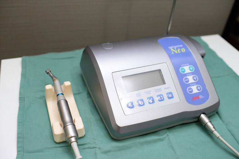 インプラント治療に使用する機器で、顎の骨にダメージを与えないように低速で一定の回転数で穴をあけていきます。