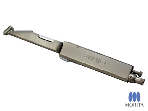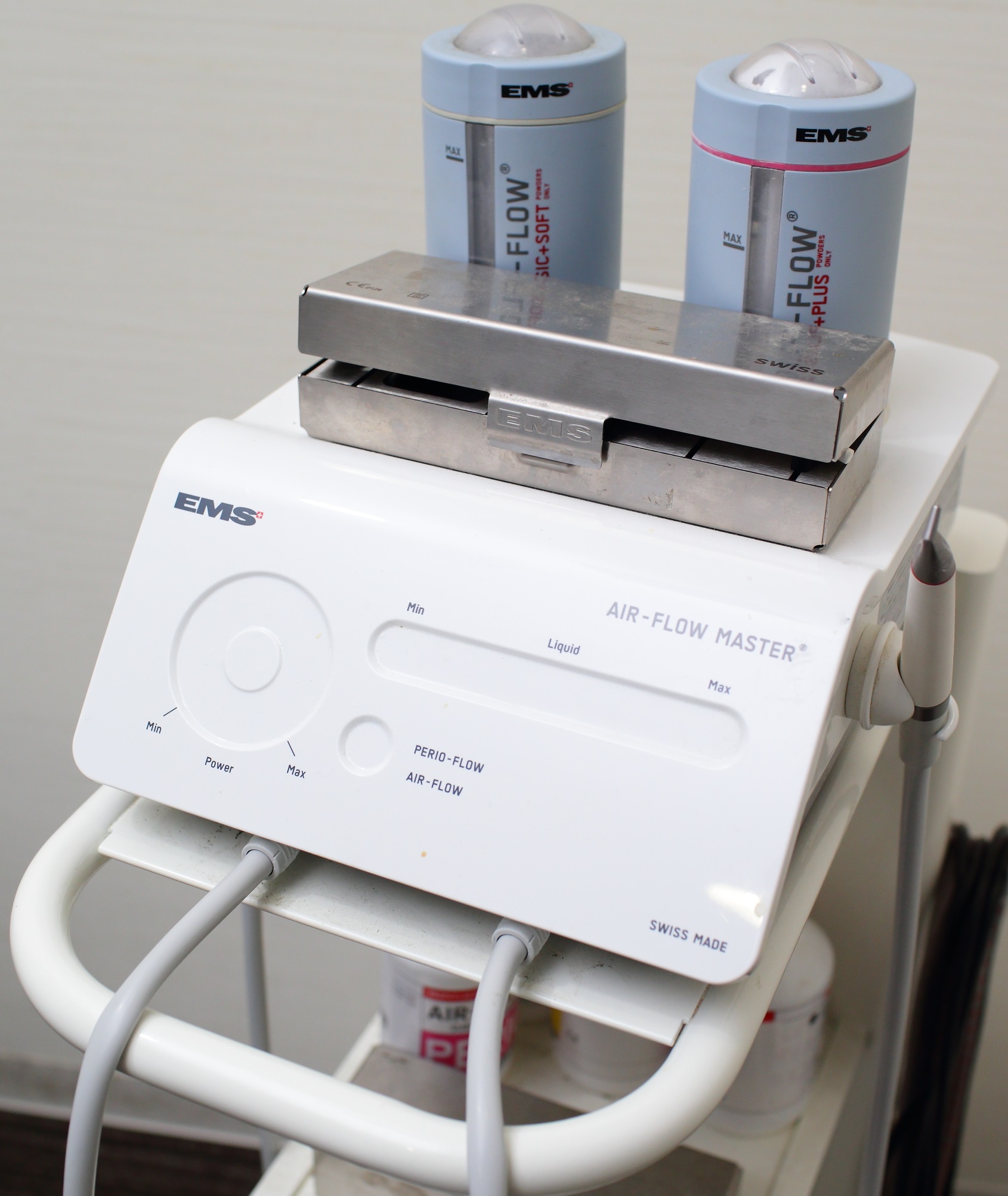 特殊なパウダーを混ぜた水・高圧エアーのスプレー洗浄で歯の表面にこびりついた頑固な歯垢」や「着色・タバコのヤニ」、細菌のかたまりである「バイオフィルム」を吹き飛ばし、清掃する器具です。