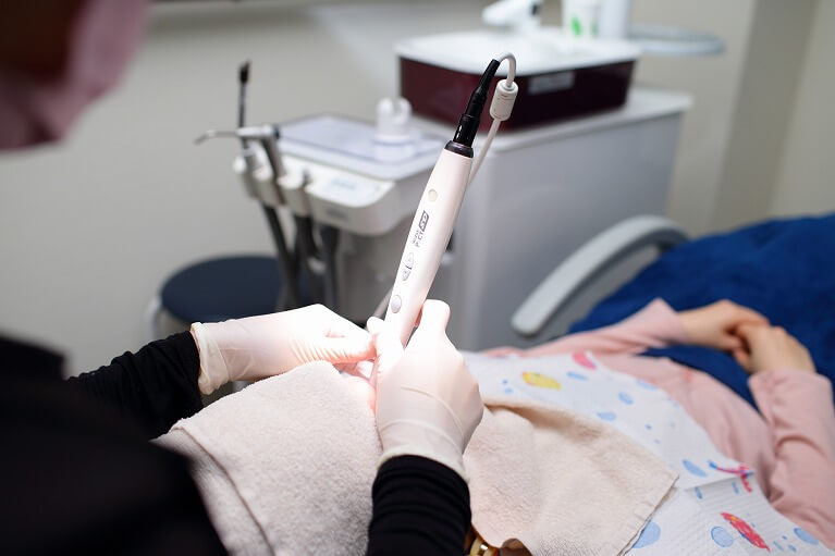 このスキャナーは、主にインビザライン(マウスピース矯正)の口腔内をデジタルで型取りするために使用します。iTeroスキャナーを使うことで、口腔内の高精度な3Dデジタルイメージを取得することができます。スキャナーを口腔内で移動させることで、歯や歯列の形状、咬合の詳細な情報を収集します。得られたデジタルイメージは、インビザラインの治療計画の作成や進行状況のモニタリングに活用されます。