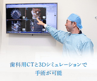 歯科用CTによる正確な検査・診断やデジタルコンピュータによる3Dシミュレーションすることで骨の状態や神経の位置などを把握しより的確なインプラント治療が可能になります。また、マイクロスコープによる拡大視野下における手術、3D光学スキャナーで負担の少ない歯型印象の採得もおこなっています。手術中は患者様の安全の為に生体モニターを常に確認しながら治療を行っております。