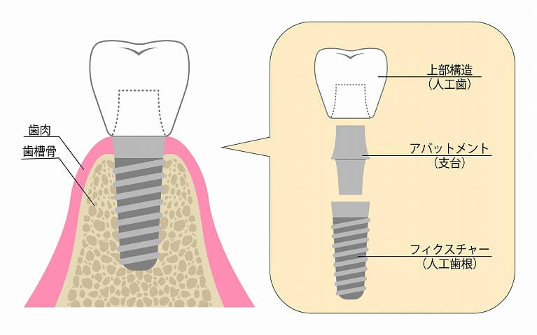 インプラントとは?インプラント治療は、顎の骨の中に人工歯根を埋入し、埋め込んだ人工歯根を土台として失った歯、および噛み合わせを再建する歯科治療のことをいいます。
