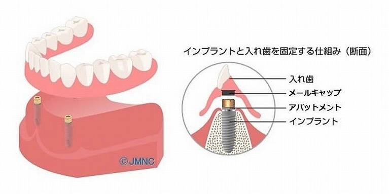 顎の骨に埋入したインプラントに特殊なボタンのようなものを装着し、そのボタンと接着する装置を入れ歯にも埋め込み固定します。