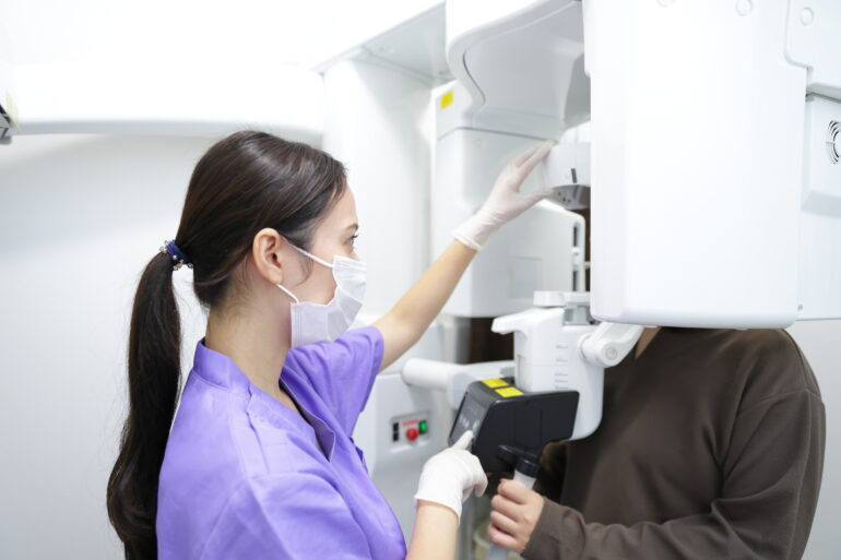 レントゲン撮影を行いますが、インプラント治療では血管や神経管の位置、骨質・骨幅などを正確に診査する必要があるため、レントゲンだけでは不十分。